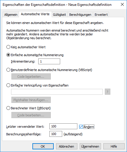 Das oben genannte Beispiel veranschaulicht eine Eigenschaft mit fortlaufender Nummerierung und Zunahme um eine ganze Zahl (Zunahme: 1). Der letzte benutzte Wert ist als 1000 eingestellt. Das nächste Objekt mit dieser Eigenschaft erhält folglich die Nummer 1001. Der Wert der Berechnungsreihenfolge beträgt 100 (siehe Berechnungsreihenfolge unten).
