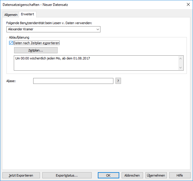 Das Kontrollkästchen der Daten nach Zeitplan exportieren Option anklicken und Zeitplan... wählen, falls dieser Datensatz anhand eines Zeitplans exportiert werden soll.