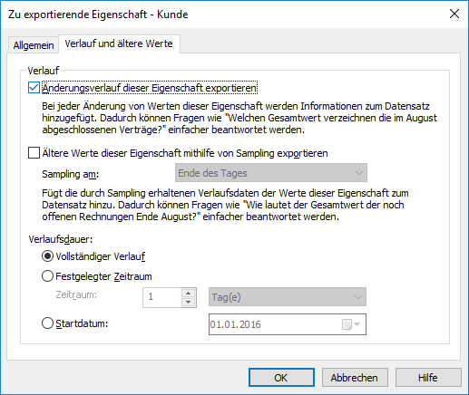 Auf der Verlauf und ältere Werte Registerkarte können Sie definieren, ob Sie den Änderungsverlauf und die vorherigen Werte der ausgewählten Eigenschaft exportieren wollen.