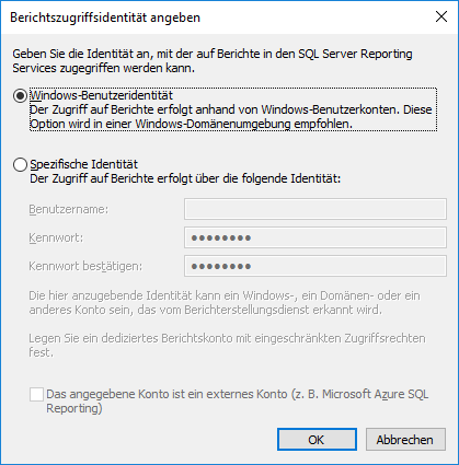 Windows-Benutzeridentität: Diese Option auswählen, um mit dem Windows-Benutzerkonto auf Berichte zugreifen zu können. Dies ist die empfohlene Vorgehensweise in Umgebungen, in denen Windows-Domänen verwendet werden.