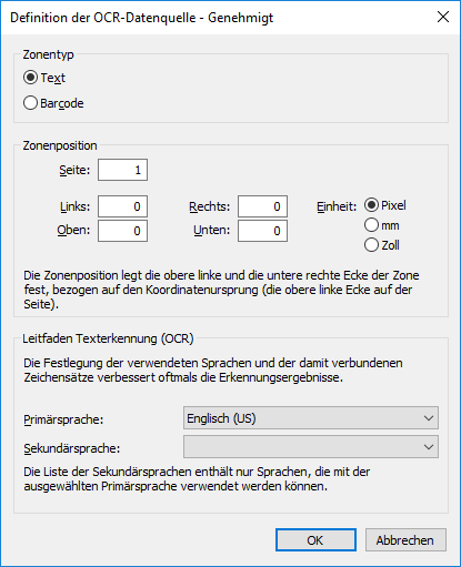 Ergebnis:Das Definition der OCR-Datenquelle Dialogfeld wird geöffnet.