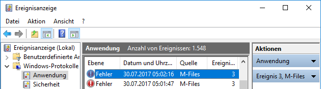 Ereignisse im Zusammenhang mit M-Files im Windows-Ereignisprotokoll regelmäßig auf Probleme prüfen, insbesondere jene, die mit der Datensicherung im Zusammenhang stehen. Sie können ein PowerShell-Skript oder eine Anwendung Dritter zum Senden von E-Mail-Nachrichten verwenden, falls eines der Ereignisse eintritt.