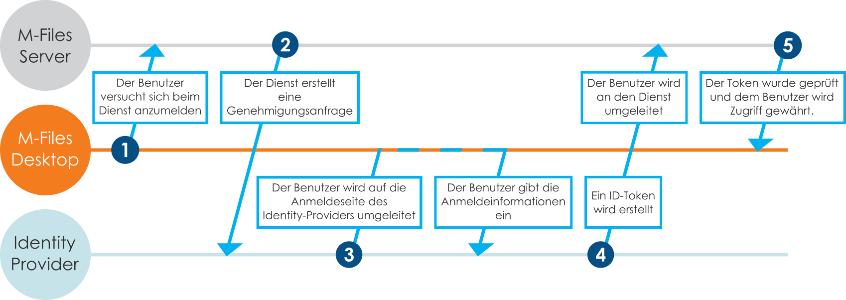 Herkömmlicherweise wurde die Anforderung an die Benutzerauthentifizierung durch die softwarespezifischen Anmeldedaten oder Windows-Anmeldedaten erfüllt. Die verknüpfte Authentifizierung bietet den Organisationen die Möglichkeit, Authentifizierungssysteme zu benutzen, die vollständig außerhalb von M-Files liegen. Die miteinander verknüpfte Authentifizierung ermöglicht es M-Files-Benutzern sich über Dienste von Drittanbietern, die von sogenannten Identitätsanbietern, wie Google oder Microsoft Entra ID, angeboten werden, zu authentifizieren. In zahlreichen Fällen kann ein zentralisierter Speicherort für alle M-Files-Benutzeranmeldedaten außerhalb des M-Files-Systems äußerst sinnvoll sein. Das verknüpfte Identitätsmanagement ermöglicht auch einen einzelnen Zugang und bietet den Benutzern die Gelegenheit, Ihre bestehenden Anmeldedaten zu verwenden.Die Authentifizierung fließt in ein miteinander verknüpftes Authentifizierungssystem.
