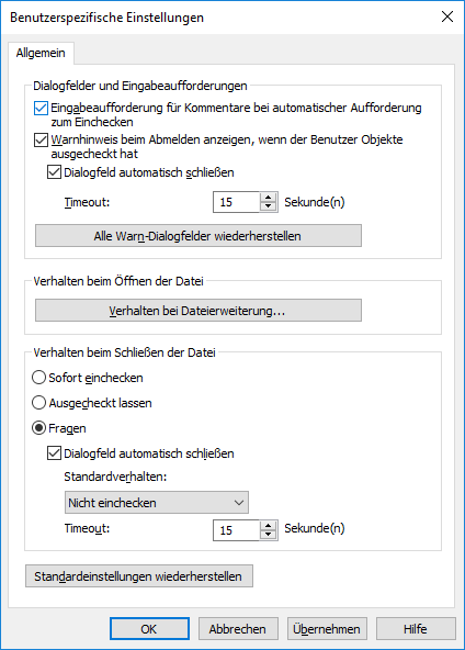 Standardmäßig wird beim Abmelden des Benutzers eine Warnung angezeigt, falls noch nicht eingecheckte Objekte vorliegen. Außerdem werden Dialogfelder nach einer festgelegten Zeitüberschreitung geschlossen.