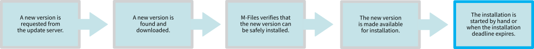 After receiving the download URL, M-Files checks that it starts with https, and if it does, downloads the digitally signed update package with Background Intelligent Transfer Service (BITS). M-Files then proceeds to verify that the update package has been created and signed by M-Files and that it has not been tampered with, therefore making sure that it can be safely installed, and finally makes the new version available for installation.