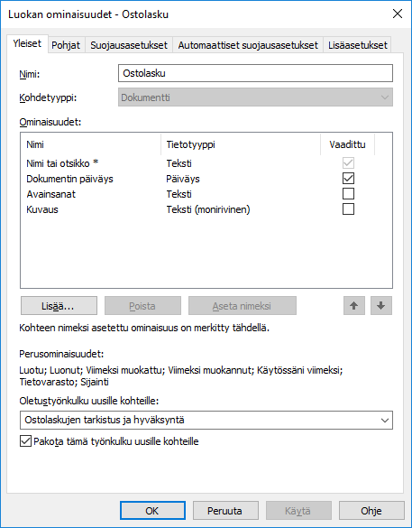 Voit määritellä oletuksena käytettävän työnkulun tähän luokkaan kuuluville uusille kohteille. Esimerkiksi kaikki laskut voidaan määritellä käymään läpi työnkulku laskujen kierrätys.