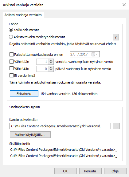 Voit katsoa arkistoitavien vanhojen versioiden lukumäärän valituilla asetuksilla napsauttamalla Esikatselu.