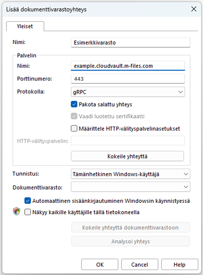 Windows-käyttöjärjestelmässä voi olla useita käyttäjiä, joilla jokaisella on omat käyttäjäkohtaiset asetukset. M-Filesin dokumenttivarastoja voidaan määritellä näytettäväksi käyttäjäkohtaisesti. Jos haluat, että dokumenttivarasto näkyy tämän tietokoneen kaikille käyttäjille, jotka käyttöjärjestelmään on määritelty, laita rasti tähän kohtaan.