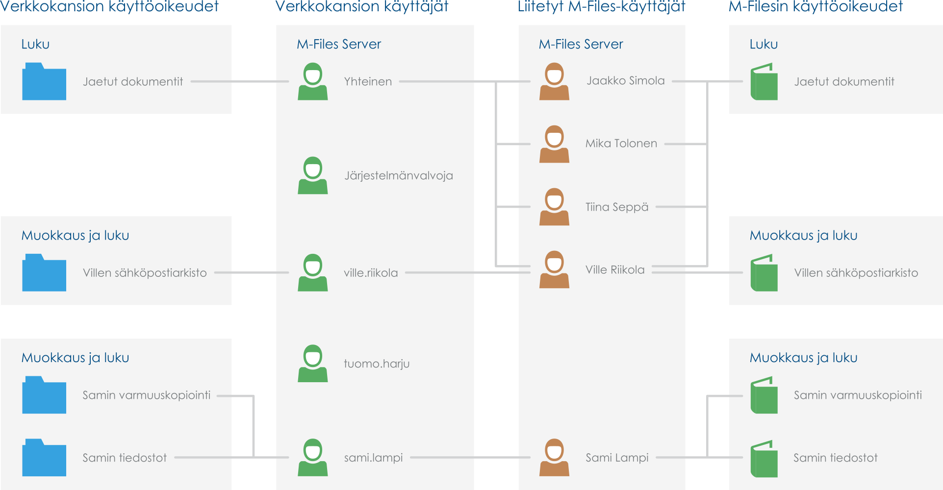 Voit tarkentaa oikeuksia ulkoisen tietovaraston sisältöön yhdistämällä ulkoisen tietovaraston käyttäjät ja M-Files-käyttäjät M-Files Adminissa.Konnektorin asetuksista riippuen M-Files-käyttäjien ja ulkoisen tietovaraston käyttäjien välille voidaan luoda automaattisia ulkoisia tietovarastoja koskevia yhteyksiä. Katso lisätietoja kohdasta Automaattinen yhteys.