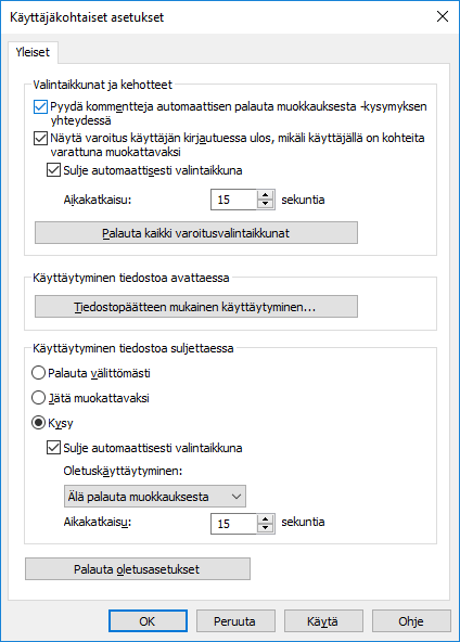 Oletusasetuksena on, että käyttäjälle näytetään aina varoitus käyttäjän kirjautuessa ulos, mikäli käyttäjällä on kohteita varattuna muokattavaksi. Samoin em. valintaikkunoille on oletusasetuksena, että valintaikkuna suljetaan aikakatkaisulla.