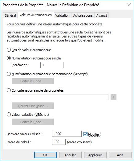 L'exemple ci-dessus illustre une propriété avec numérotation automatique par incréments de numéro entier simple (incrément : 1). La dernière valeur utilisée est définie sur 1 000. Pour cette raison, l'objet suivant qui utilisera cette propriété sera numéroté 1 001. La valeur d'ordre de calcul est 100 (voir Ordre de calcul ci-dessous).