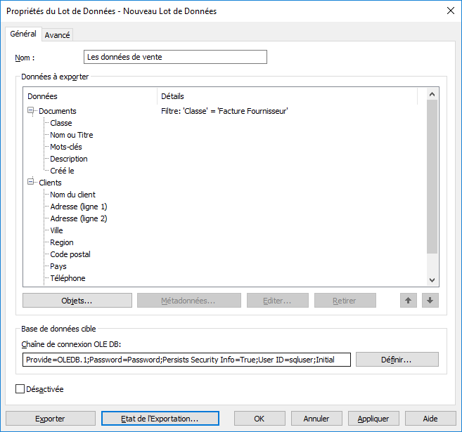 Sélectionnez l’objet que vous venez d’ajouter à la rubrique Données à exporter et cliquez sur Ajouter propriété... pour ajouter au type d’objet sélectionné une propriété que vous souhaitez exporter.