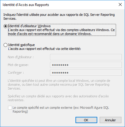 Identité spécifique : Afin de définir une identité spécifique pour accéder aux rapports, sélectionnez cette option et saisissez le nom d’utilisateur et le mot de passe de l’identité dans les champs Utilisateur et Mot de passe. L'identité peut correspondre à un compte Windows local, à un compte de domaine ou à un quelconque autre compte reconnu par le service d'établissement de rapports. Le compte d’établissement des rapports à spécifier ne devrait avoir que des autorisations d’accès limité aux services d’établissement des rapports. Cochez la case Le compte spécifié est un compte externe (ex: Microsoft Azure SQL Reporting) si le compte spécifié est un compte externe.
