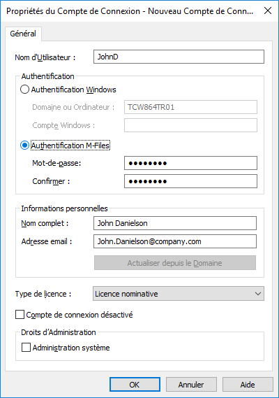 Saisissez une adresse e-mail et un nom complet pour le compte de connexion. Ces informations sont utilisées pour envoyer les notifications. Pour davantage d'informations sur les notifications, consultez Modifier des paramètres de notification dans M-Files Admin. Si le mode d'authentification utilisé est l'authentification Windows, vous pouvez obtenir les informations personnelles depuis le domaine en sélectionnant Actualiser depuis le domaine.