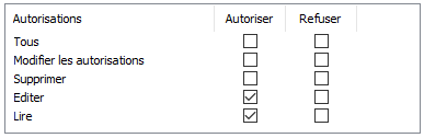 - La case Autoriser si vous souhaitez donner l’autorisation sélectionnée à l’utilisateur ou au groupe d’utilisateurs.