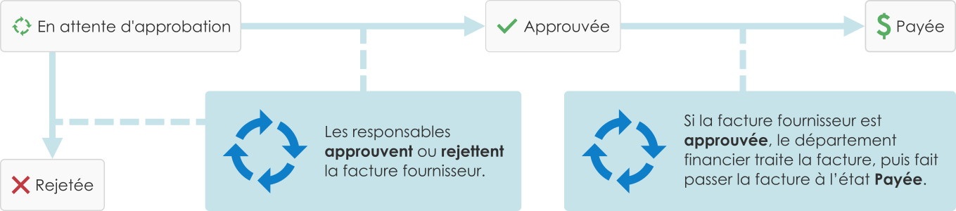 Vous pouvez par exemple utiliser les workflows pour faire circuler les factures d'achat. Les étapes du workflow peuvent alors inclure :