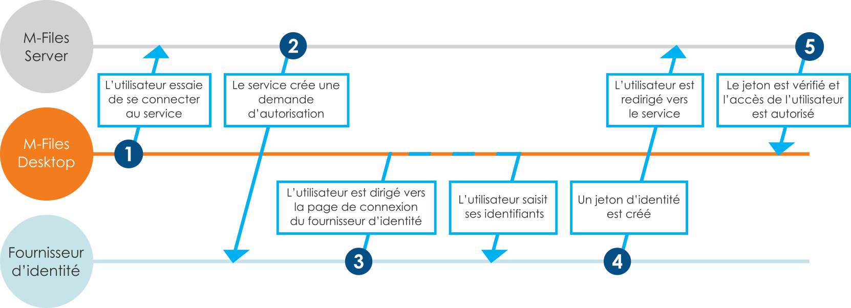 En règle générale, l'identité de l'utilisateur est vérifiée à l'aide d'identifiants spécifiques au logiciel ou des identifiants Windows. L'authentification fédérée offre aux organisations la possibilité d'utiliser un système d'authentification qui est complètement externe à M-Files. L’authentification fédérée permet aux utilisateurs de M-Files d’être authentifiés à l’aide de services tiers appelés fournisseurs d’identité, tels que Google ou Microsoft Entra ID. Très souvent, le fait d'avoir un référentiel centralisé pour tous les identifiants d'utilisateur M-Files complètement en dehors du système M-Files peut se révéler très utile. La gestion de l'identité fédérée permet également une authentification intégrée et fournit aux utilisateurs la possibilité d'utiliser leurs propres identifiants.Flux d’authentification dans un système d’authentification fédérée.