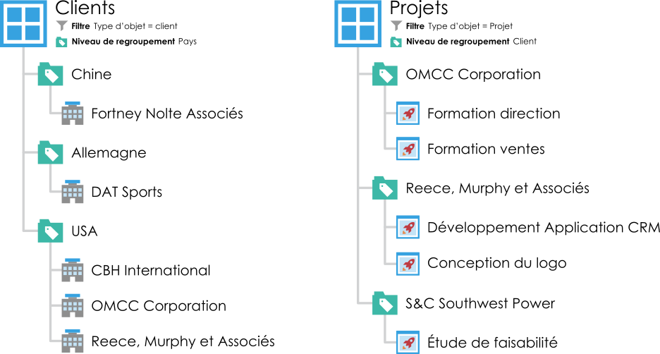 Ces exemples utilisent les informations relatives aux clients, aux projets et aux pays pour regrouper les objets.