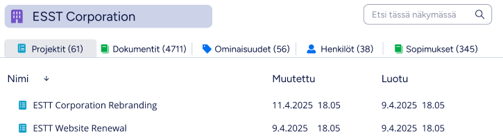Jos välilehdellä on kohteita, jotka voi avata työtilassa, voit avata myös niiden työtilat. Jos esimerkiksi avaat asiakkaan työtilan ja siirryt Projektit-välilehdelle, voit avata projektin työtilan kaksoisnapsauttamalla projektia. Pääset edelliseen työtilaan Takaisin-toiminnolla.