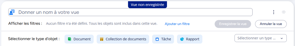 À gauche, vous pouvez donner un nom à votre vue et ajouter ou modifier les filtres de vue. Vous pouvez également sélectionner les types d’objets à afficher dans la vue. Si vous ne sélectionnez aucun type d'objet, la vue contiendra tous les types d'objets disponibles dans le coffre. Lorsque vous ouvrez le menu déroulant Sélectionner le type d’objet, vous voyez tous les types d’objets.