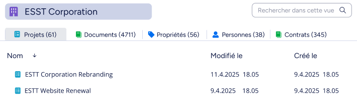 Un espace de travail affiche tous les contenus associés à un objet, par exemple un client. Par exemple, vous pouvez ouvrir un espace de travail pour un objet client afin de voir tous les éléments qui lui sont associés, par exemple les projets, documents et contrats, sous forme d'onglets.